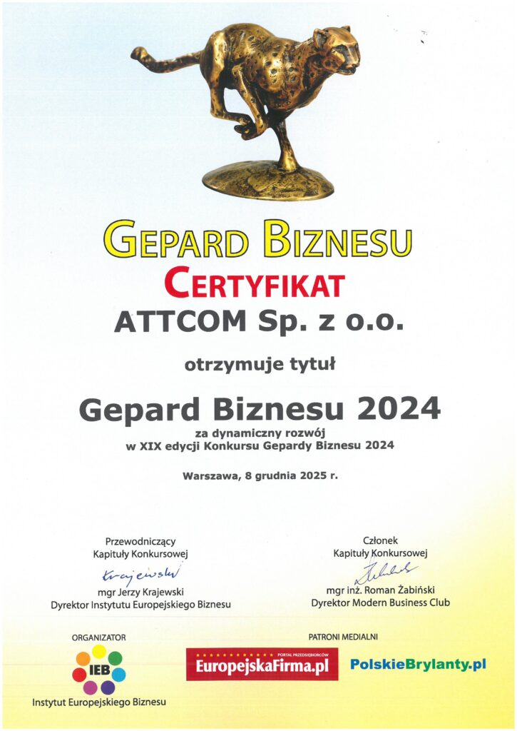 Spółka została ponownie wyróżniona przez Instytut Europejskiego Biznesu w XIX edycji Konkursu Gepardy Biznesu 2024, na podstawie analizy wyników finansowych Krajowego Rejestru Sądowego. Przyznany tytuł potwierdza wysoką wiarygodność i dalszy dynamiczny rozwój naszej firmy.